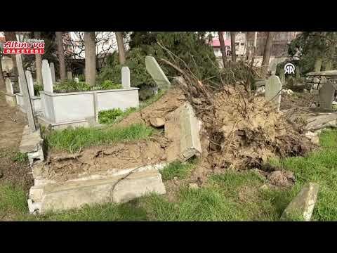 Alaçam'da fırtına mezarlıkta hasara neden oldu