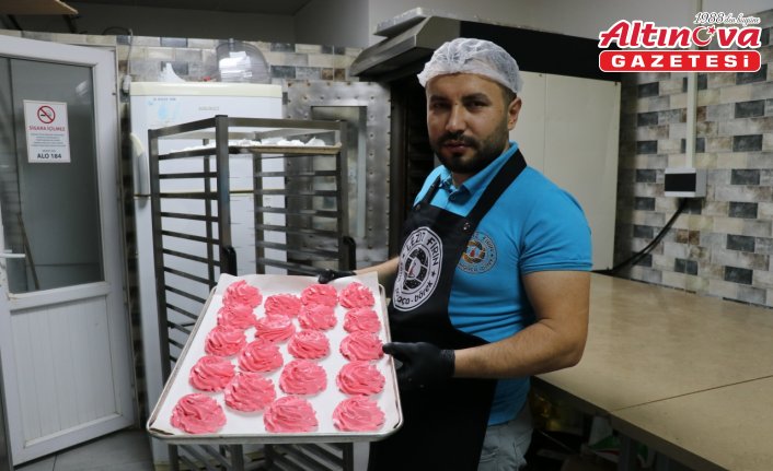 Makinede çırpılan yumurta akı ve şeker, daha sonra tepsilere dökülüyor ve fırında 1 saat pişiriliyor.