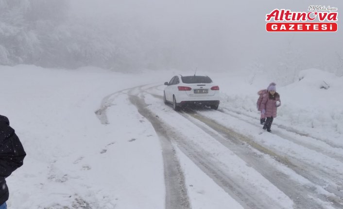 Kar kalınlığının yer yer 30 santimetreye ulaştığı ilçede belediye ekipleri iş makineleriyle kapanan yolları ulaşıma açmak için çalışma yürütüyor.