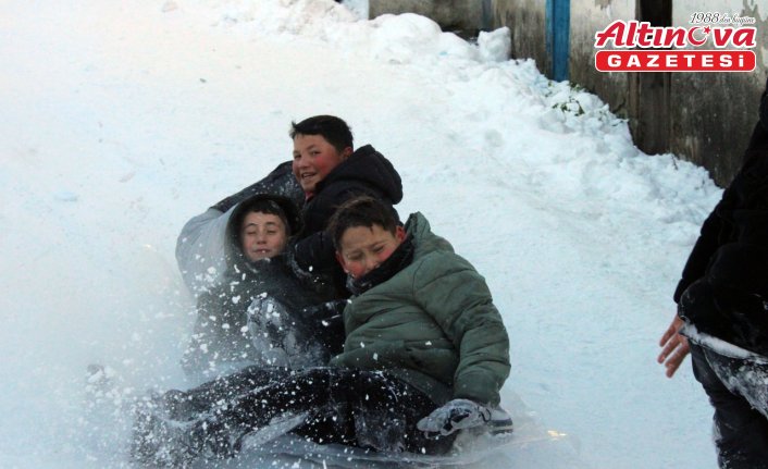 Mahalle yolunu kızak pistine çeviren çocuklar karın tadını çıkardı