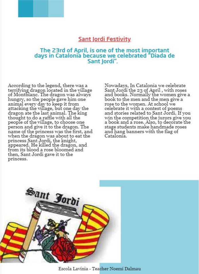 Bugünlerde Katalonya’da 23 Nisan Sant Jordi gününü güller ve kitaplarla kutluyoruz. Normalde kadınlar erkeklere kitap, erkekler kadınlara gül verir. Okulda Sant Jordi’yle ilgili şiir ve hikayelerden oluşan bir yarışmayla kutlarız. Yarışmayı kazanırsanız jüri üyeleri size bir kitap ve gül verir. Ayrıca, öğrenciler sahneyi süslemek için el yapımı güller yaparlar ve Katalonya bayrağı ile pankartlar asarlar.