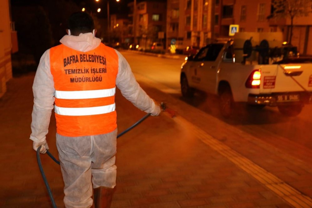 Hafta içi ve hafta sonu planlı çalışmalarını yürüten Bafra Belediyesi ekipleri gerek insan yoğunluğu, gerekse araç yoğunluğunun olmadığı sokağa çıkma kısıtlamasının olduğu bugünlerde daha geniş kapsamlı çalışmalarını daha hızlı bir şekilde tamamlıyor.