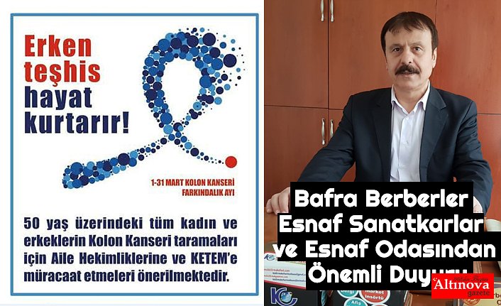 Akay, Bafra İlçe Sağlık Müdürlüğü KETEM Biriminde Mart Ayı Bağırsak Kanseri Farkındalık Ayı kapsamında 50-70 yaş arası erkek ve bayanlara,akraba ve yakınlarına ücretsiz kanser taramaları yapılmakta. Bu önemli Sağlık Konusunda Berberler Esnaf Sanatkarlar ve Esnaf Odası olarak Odamıza Üye olan Meslektaşlarımız ve yanında çalışanların eş - dost ve akrabalarına Ücretsiz olarak " Bağırsak Kanseri" tanımı tesisi Bafra İlçe Sağlık Müdürlüğü KETEM tarafından yapılacaktır.
