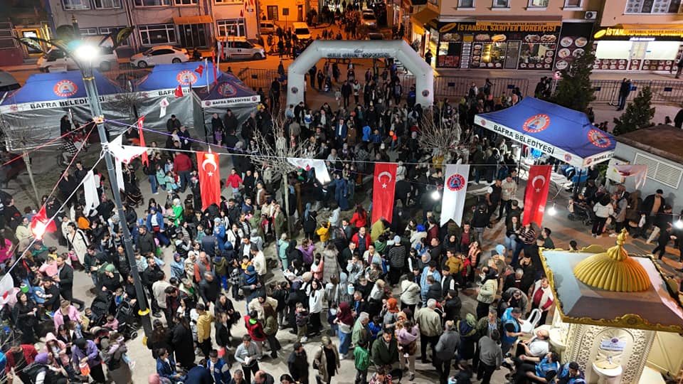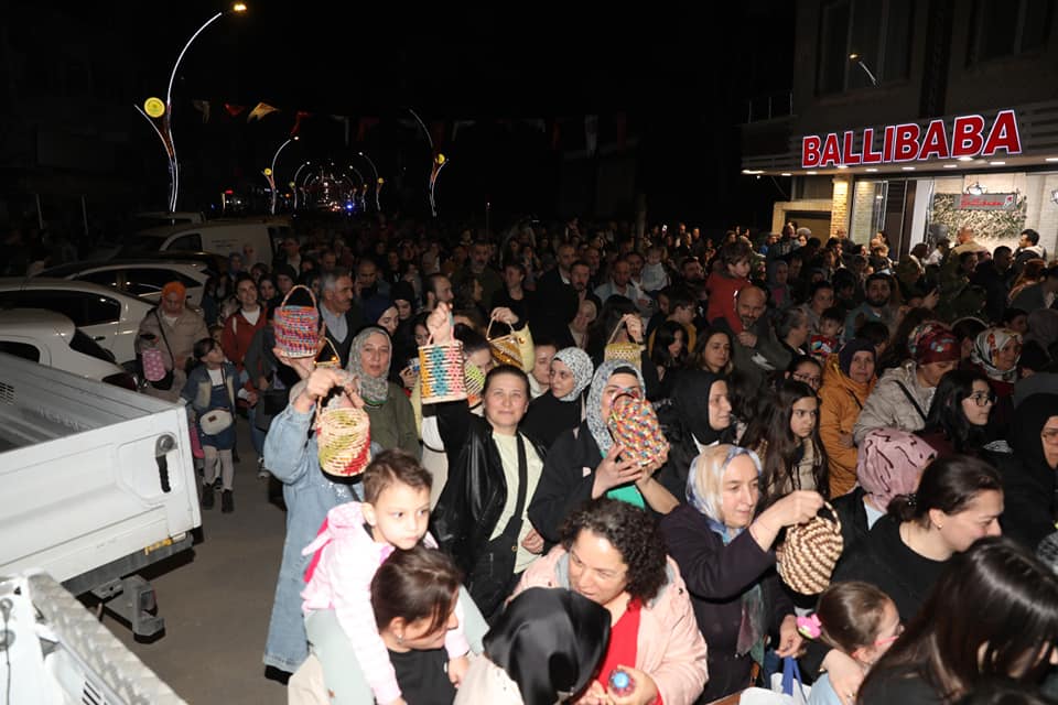 Bafra Belediyesi ev sahipliğinde ramazanın 14. gününü 15. güne bağlayan gece gerçekleştirilen "Sele Sepet Top Kandil Şenliği" kapsamında, Mehmet Akif Ersoy İlkokulu önünde toplanıldı.