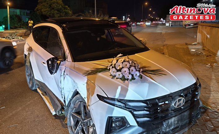 Çarpışmanın etkisiyle yoldan çıkan gelin arabası, refüjdeki çelik bariyere çarparak durdu.