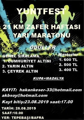 Bafra ilçesinde düzenlenecek olan YUNTFEST'te 21 Kilometre Zafer Haftası Maratonunda koşacak olan sporcular için son kayıt tarihi 23 Ağustos 2019 günü olacak. Düzenlenecek olan maraton 25 Ağustos 2019 saat 10.00 Kolay Mahallesinde yapılacak. 23 Ağustos günü başalayacak festivalde bisisklet, kano, yarı maraton, şiir dinletisi ve maratona katılanlara makarna partisi gibi etkinlikler olacak. 3 gün sürecek olan festival 26 Ağustos tarihinde Pazartesi akşamı sona erecek.