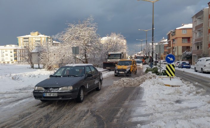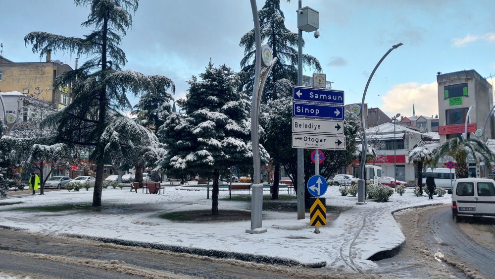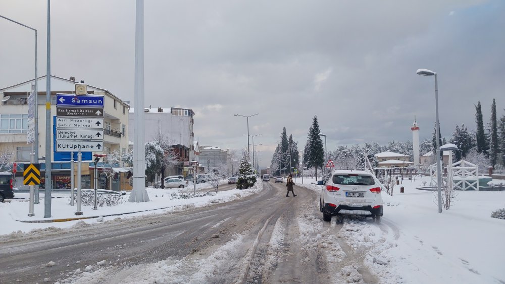 Samsun’un Bafra ilçesinde sabah saatlerinde başlayan kar ilçeyi beyaza bürüdü.