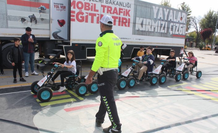 Trafik Başkanlığı tarafından ilköğretim çağındaki çocuklara yönelik teorik ve uygulamalı trafik eğitimleri gerçekleştirmek üzere tasarlanan "Mobil Trafik Eğitim Tırı" ile ekipler öğrencilere trafik kurallarını anlattı