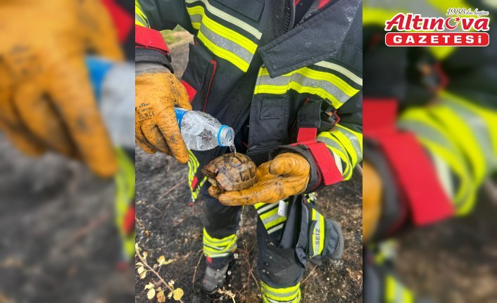 Soğutma çalışması yapan itfaiye ekipleri, küle dönmüş alanda bir kaplumbağa yavrusunun yangından etkilendiğini fark etti. Kaplumbağayı alan ekipler, üzerine su dökerek serinlemesini sağladı.