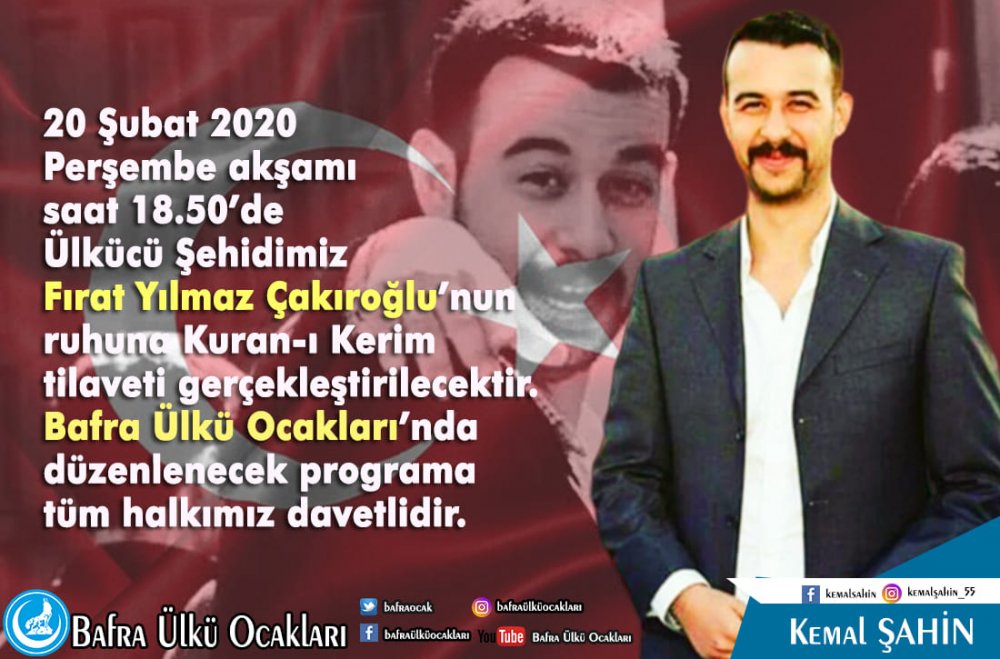 20 Şubat 2015 tarihinde Ege Üniversitesinde PKK'lı örgüt mensubu tarafından bıçaklanarak öldürülen Fırat Yılmaz Çakıroğlu tüm ülke genelinde olduğu gibi Bafra'da da anılacak. Konuyla ilgili davette bulunan Bafra Ülkü Ocakları Başkanı Kemal Şahin "Şehadetinin sene-i devriyesinde Ülkücü Şehidimiz Fırat Yılmaz Çakıroğlu'nu ve tüm Şehitlerimizi anma programına tüm hemşehrilerimiz davetlidir"ifadelerini kullandı.
