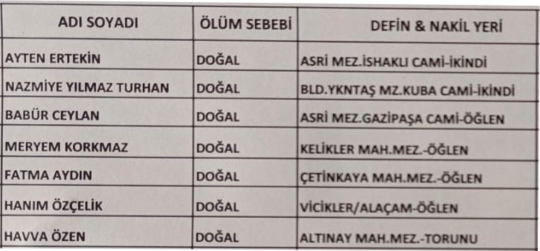 14Aralık 2024 Cumartesi Bafra vefat edenler.
