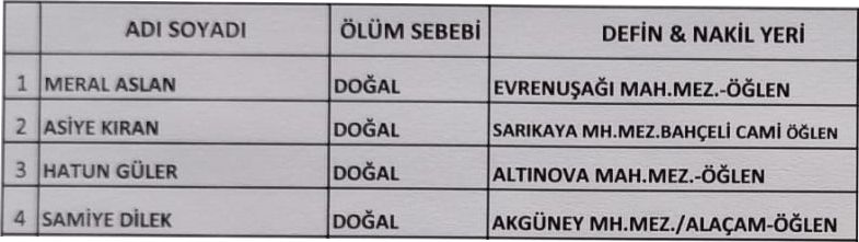 21 Aralık 2024 Cumartesi Bafra vefat edenler.