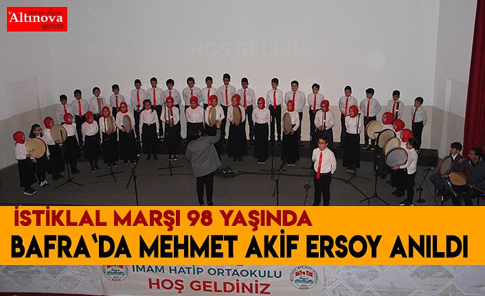 Bafra Kaymakamlığı ve Bafra Milli İrade İmam Hatip Ortaokulu tarafından hazırlanan 98. Yılında İstiklal Marşının kabulü ve Mehmet Akif Ersoy`u anma programı Bafra Belediyesi Kültür Merkezinde düzenlendi.