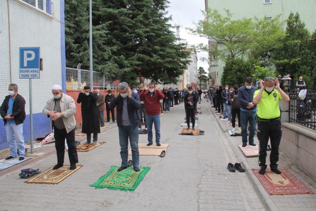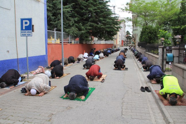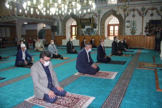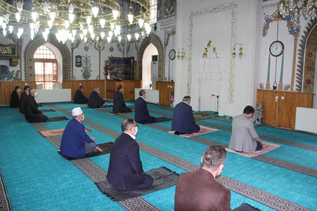 Vatandaşlar kendi seccadelerini alarak belirlenen camilere geldiler ve sosyal mesafe kularına dikkat ederek aralıklarla saf tuttular.