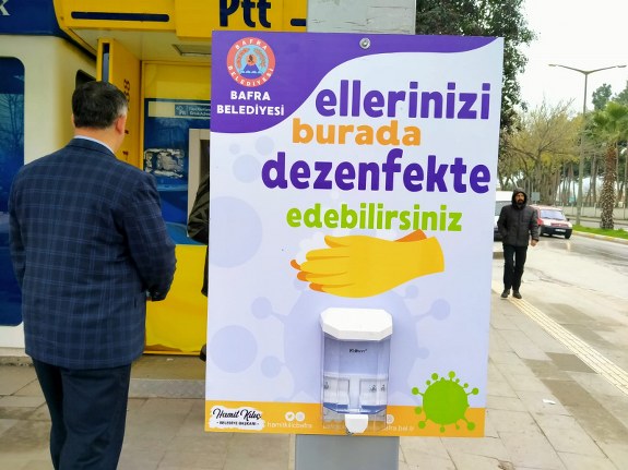 Samsun’un Bafra ilçesinde koronavirüse karşı alınan tedbiler kapsamında iş yerleri dezenfekte edildi. ATM önlerine dezenfektanlar bırakıldı.