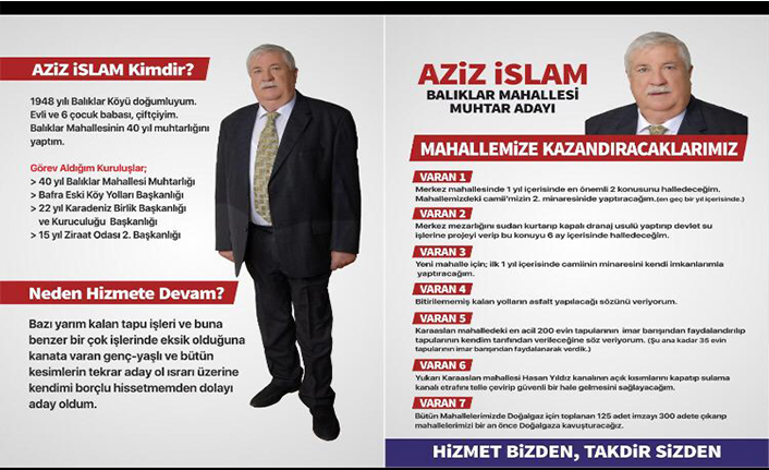 1948 yılında Balıklar Mahallesinde doğdu. Evli ve 6 çocuk babası olan Aziz İslam çiftçilik ile uğraşıyor. Ayrıca İslam, Balıklar Mahallesinde 40 yıl muhtarlık yaptı.