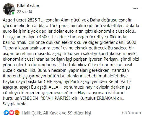 Yeniden Refah Partisi Bafra İlçe Başkanı Bilal Arslan sosyal medya hesabı üzerinden hükümetin asgari ücret ve ekonomi politikasına eleştirilerde bulundu.