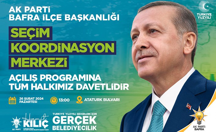 Bizleri hiçbir zaman yalnız bırakmayan duaları ve desteğini esirgemeyen kadirşinas hemşehrilerimizle bir arada olabilmek onların görüş ve önerilerini dinleyebilmek adına 26 Şubat Pazartesi günü saat 13.00’de Atatürk Bulvarı Güven Sokak kavşağında yer alan Seçim Koordinasyon Merkezimizin de açılışını gerçekleştirmiş olacağız.” diyen Bafra Belediye Başkanı ve Cumhur İttifakı Ak Parti Bafra Belediye Başkan Adayı Hamit Kılıç sözlerini “Gönül birlikteliğimizi bu güzel ve özel günde bir kez daha taçlandırmak arzusuyla tüm vatandaşlarımızı SKM’mizin açılışına bekliyoruz” şeklinde tamamladı.