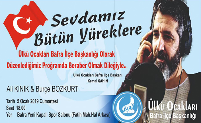Samsun`un Bafra ilçesinde düzenlenecek olan Sevdamız Bütün Yüreklere isimli konser için çalışmalarını tamamlayan Ülkü Ocakları Bafra İlçe Başkanlığı Ankara ziyareti gerçekleştirerek Milliyetçi Hareket Partisi Genel Başkanı Devlet Bahçeli`ye davetiye verdi. Yapılan ziyaretten dolayı memnuniyetini dile getiren Bahçeli düzenleyecekleri programın hayırlı olmasını diledi. Ayrıca Ankara`da TBMM`de de birtakım ziyaretler gerçekleştiren Ülkü Ocakları Bafra İlçe Başkanı Kemal Şahin ve yönetimi Başbuğ Alparslan Türkeş`in de kabrini ziyaret etti. Sevdamız Bütün Yüreklere isimli konser 5 Ocak Cumartesi günü Yeni Kapalı Spor Salonunda düzenlenecek.