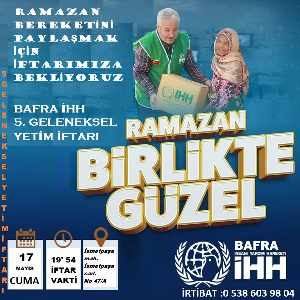 İHH Bafra Şubesi, yetim çocuklara destek amaçlı bir iftar programı düzenliyor. İnsani Yardım Derneği Bafra Şube Başkanı İlyas Altuntaş`ın yaptığı açıklamada "Bizler İHH olarak yetim ve yoksul kardeşlerimiz için bu yıl 5.`sini düzenlediğimiz Geleneksel İftar programımıza tüm vatandaşlarımızı davet ediyoruz" dedi.