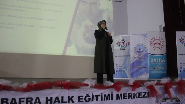 Kurum Müdürü Hacı AVCI selamlama konuşmasında, sosyal medyanın ve mahremiyetin öneminden bahsederek, bu amaçla Bafra Halk Eğitimi Merkezi ve Bafra Rehberlik Araştırma Merkezi ile işbirliği yaparak planladığımız bu çalışmaya fikirleri ile desteklerini esirgemeyen Bafra Kaymakamı Sayın Cevdet ERTÜRKMEN'e, Hastalığından dolayı aramızda bulunamayan İlçe Milli Eğitim Müdürümüz Mehmet Ali KATİPOĞLU'na, Yaygın Eğitim'den Sorumlu Şube Müdürümüz Celal KARADELİ'ye, Şube Müdürümüz Süleyman ERTÜRK'e, Bafra Rehberlik Araştırma Merkezi Müdürü İlker KARAKAYA'ya, sunum yapan Bafra Rehberlik Araştırma Merkezi Rehber Öğretmenlerine, katkı ve katılımları için herkese teşekkür etti.