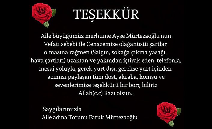 Ailemizin büyüğü Babaannemiz Ayşe Mürtezaoğlu’nun cenazesine olağanüstü şartlar olmasına rağmen (salgın,sokağa çıkma yasağı, hava şartları) uzaktan ve yakından iştirak eden telefonla mesaj yoluyla gerek yurt içi gerek yurt dışı acımızı paylaşan tüm dost akraba komşu ve sevenlerimize teşekkürü bir borç biliriz. Allah Razı Olsun.