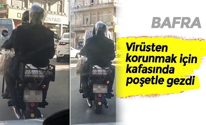 Samsun’un Bafra ilçesinde ismi öğrenilemeyen bir kişi korona virüsten korunmak için bulduğu ilginç yöntem görenlerin dikkatini çekti. Motosiklet üzerinde kafasında alışveriş poşeti ile gezen vatandaşı fark eden sürücüler bu anın görüntülerini çekerek sosyal medya üzerinden paylaştı. Çevredekilerin dikkatli bakışlarına aldırış etmeyen yolculuğuna bu şekilde devam etti.