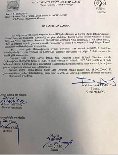 Bu imzanın ardından bundan sonra ihracata yönelik tarımsal ürünlerin kalitesinin artırılması için laboratuvar ortamının da yer alacağı Bafra Ovası’na kurulması planlanan Bafra Tarıma Dayalı İhtisas Sera Organize Sanayi Bölgesi kent ve ülke ekonomisine önemli katkılar sağlayacak. Bafra Tarıma Dayalı İhtisas Sera Organize Sanayi Bölgesi Bafra ilçemizin Doğankaya bölgesinde bin 200 dönümlük araziye kurulacak. Bafra Tarıma Dayalı İhtisas Sera Organize Sanayi Bölgesi kimya laboratuvarı gibi çalışacak. Bu Tarıma Dayalı İhtisas Sera Organize Sanayi Bölgesi'nde fidan, tohum, sebze, meyve ve çiçek üretimiyle ilgili çalışmalar yapılacak. Çarşamba'da gördüğüm iyi tarım uygulama serasından çok etkilenmiştim. Böyle bir çalışmayı Bafra Tarıma Dayalı İhtisas Sera Organize Sanayi Bölgesi’nin kurulmasıyla birlikte Bafra'ya da taşırsak artık Samsun dışarıdan sebze meyve alma yerine, tam tersi çevresine pazarlayan hatta ihracat yapan bir alan haline gelecek. Arazi, gelişme ve genişlemeye de çok müsait. Bafra Tarıma Dayalı İhtisas Sera Organize Sanayi Bölgesi’nin yöreye ve ülke ekonomisine ciddi katkılar sağlayacağına inanıyorum. Bu sanayi bölgesinin Bafra ilçemize, ilimize ve ülkemize hayırlı olmasını diliyorum.”dedi.