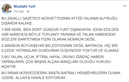 Bafra İlçesi`nde bir haber sitesinin kendisi ile alakalı yapmış olduğu habere basın açıklaması yaparak açıklık getirmek yerine sosyal medya hesabından “BU İNSAN MÜSVEDDESİNİ, BAŞTA BAFRALI HEMŞEHRİLERİM OLMAK ÜZERE, ALLAH’A HAVALE EDİYORUM” şeklinde tepki gösteren Samsun Büyükşehir Belediyesi Genel Sekreter Yardımcısı Mustafa Yurt, Bafralı vatandaşların tepkisini çekti. Bafra, ya hizmet verilmediğini ve üvey evlat konumunda olduğunu dile getiren vatandaşlar, “ BAFRA`YA NE YAPTINIZ DA KONUŞUYORSUNUZ” diyerek tepki gösterdi.