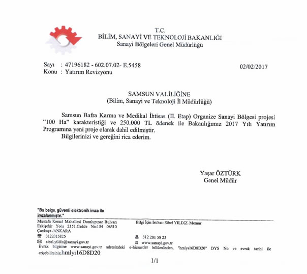 14 Ocak 2017 tarihinde resmi gazetede yayınlanarak yatırım programına alınan Samsun Bafra Karma ve Medikal İhtisas (II. Etap) Organize Sanayi Bölgesinin Alt Yapı Keşif ve Proje hazırlama giderleri için T.C. Bilim Sanayi ve Teknoloji Bakanlığı Sanayi Bölgeleri Genel Müdürü Sayın Yaşar ÖZTÜRK’ün imzası ile 250.000,00 TL başlangıç ödeneği 2017 Yılı Yatırım Programında yeni proje olarak dahil edildiğini açıkladı.