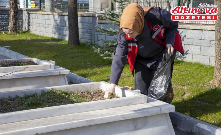 Mezar taşlarının üzerindeki tozları süpüren ekipler, çiçeklerin bakımını da yaparak kabirlere su döktü.