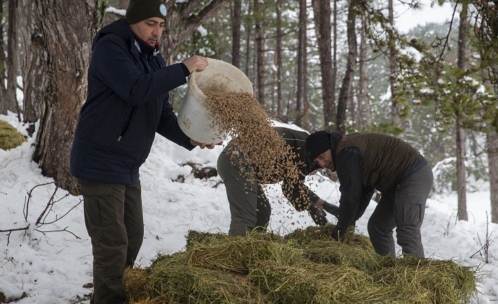 Ekipler, geyik ve karaca gibi yaban hayvanları için de zaman zaman besleme çalışması gerçekleştiriyor. BOLU (AA)