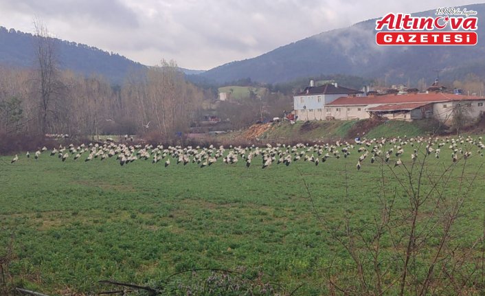 Göç yolundaki onlarca leylek, Bolu'nun Göynük ilçesinde mola verdi.