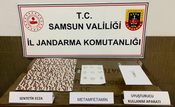 Durdurulan araçtaki aramada, 448 sentetik ecza hapı, 32 gram metamfetamin ve uyuşturucu kullanma aparatı ele geçirildi.