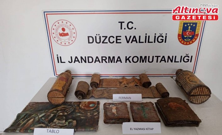 Düzce'de, Roma ve Bizans dönemlerine ait olduğu değerlendirilen 3 tarihi el yazması kitap, 2 sandıklı şerit halinde Tevrat ve tablo ele geçirilen operasyonda, 4 şüpheli gözaltına alındı.