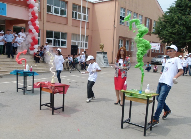 Saygı duruşundan sonra istiklal marşı okundu. Anasınıfının gösterisi, hızlı köpük deneyi ve ilkokul öğrencilerinin gösterisi ilgi gördü.