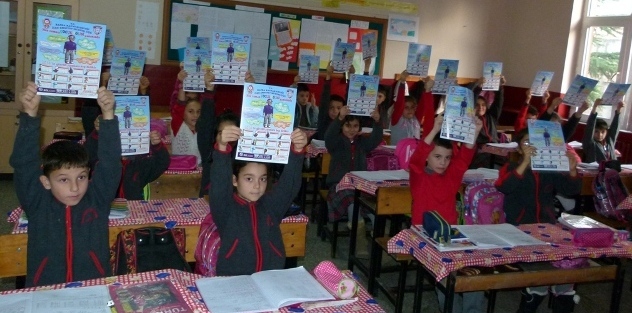 Üzerinde çocukların güvenliği için dikkat edecekleri hususları içeren yazıların bulunduğu takvimler Toplum Destekli Polislik Büro Amirliği Başpolis Metin Cabbar ve Polis Memuru Nalan Çetinkaya tarafından Barbaros İlkokulu'nda öğrencilere dağıtıldı.