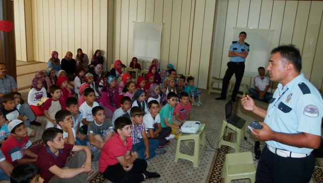 Bafra Emniyet Müdürlüğüne bağlı Trafik Tescil ve Denetleme Büro Amirliği ile Toplum Destekli Polislik Büro Amirliği ekipleri, yaz tatilinde camilerde açılan Kur’an Kurslarına katılan çocuklara trafik kurallarıyla ilgili eğitimler veriyor.