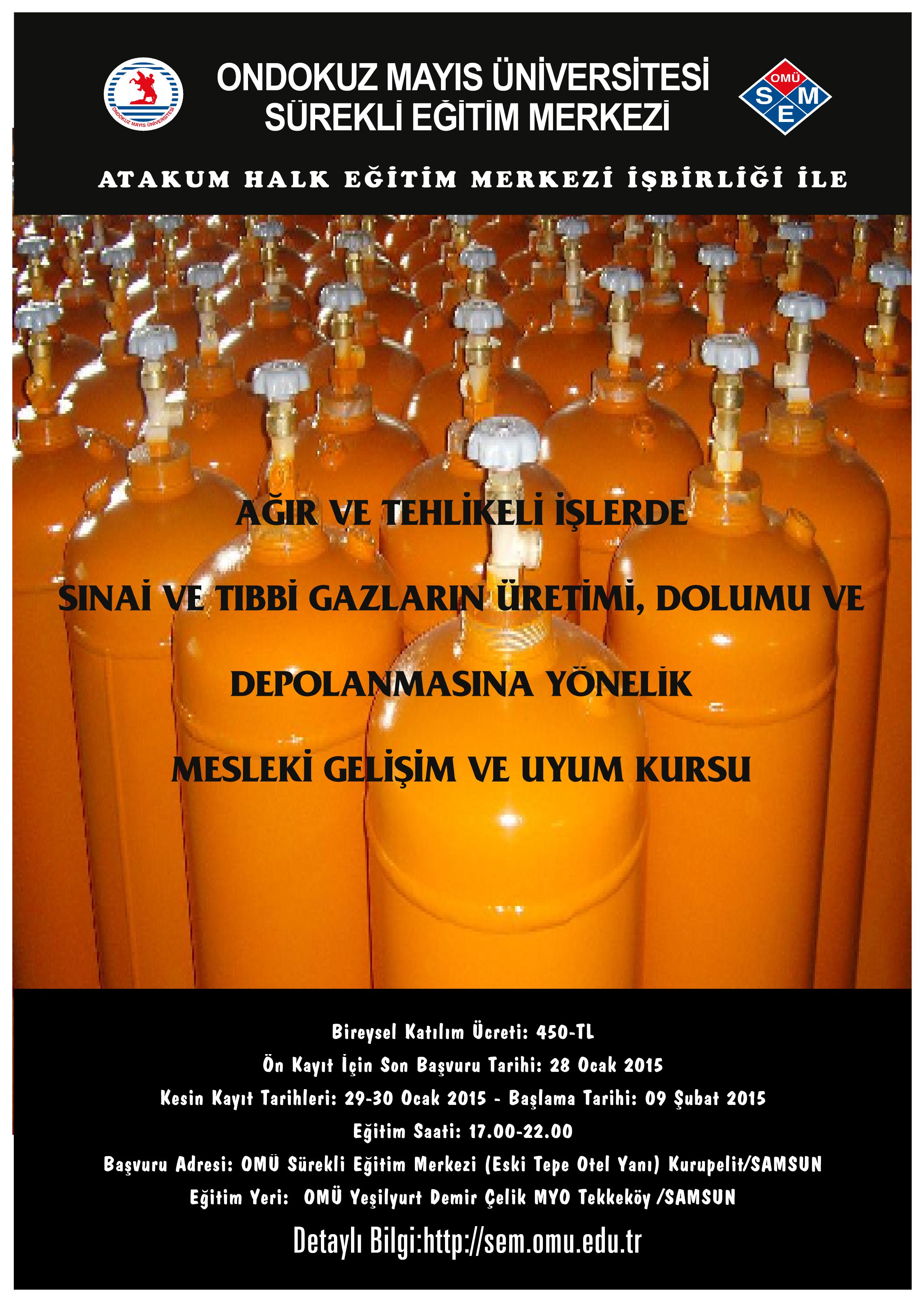 Ondokuz Mayıs Üniversitesi Sürekli Eğitim Merkezi (OMÜSEM) ile Atakum Halk Eğitim Merkez Müdürlüğü arasında Milli Eğitim Bakanlığı (MEB) onaylı sertifika programlarının açılması yönünde imzalanan protokol gereğince, toplam kırk saat sürecek olan “Ağır ve Tehlikeli İşlerde Sınai ve Tıbbi Gazlar Üretim, Dolum ve Depolama Eğitimi”nin başvuraları sona ermek üzere. Başvurular 30 Ocak 2015 Cuma gününe kadar Ondokuz Mayıs Üniversitesi Sürekli Eğitim Merkezi’ne yapılabilecek. Kurslar ise OMÜ Yeşilyurt Demr Çelik MYO’da 9 Şubat ve 20 Şubat tarihleri arasında saat 17:00-22:00 saatleri arasında yapılacak.