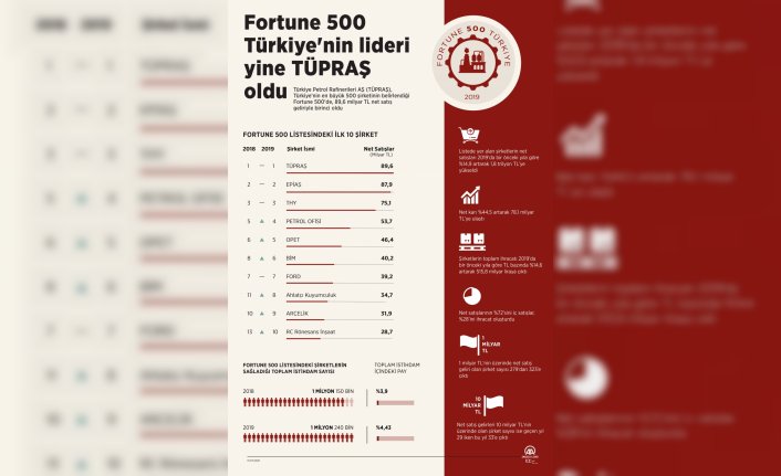 Bu yıl 13’üncüsü açıklanan, finansal kurumlar ve holding dışındaki tüm sektörleri kapsayan Fortune 500 Türkiye listesinin ilk sırasında yine TÜPRAŞ yer aldı. 89,6 milyar TL net satış geliriyle Fortune 500 Türkiye zirvesindeki yerini koruyan TÜPRAŞ’ın, Fortune 500’de yer alan şirketlerin toplam net satış gelirlerinden aldığı pay ise yaklaşık yüzde 5 oldu.
