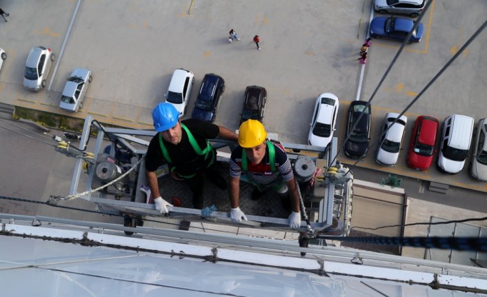 Halatlara takılı sepet yardımıyla alışveriş merkezinin çatısından inerek camların dış temizliğini gerçekleştiren işçiler, zor bir meslek olmasına karşılık işlerini severek yapıyor.