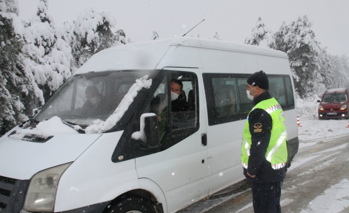 Kızlan mevkisine gidecek sürücülerin araçlarını kontrol eden ekipler, kış lastiği ve zinciri takılı olmayanların geçmesine izin vermedi.