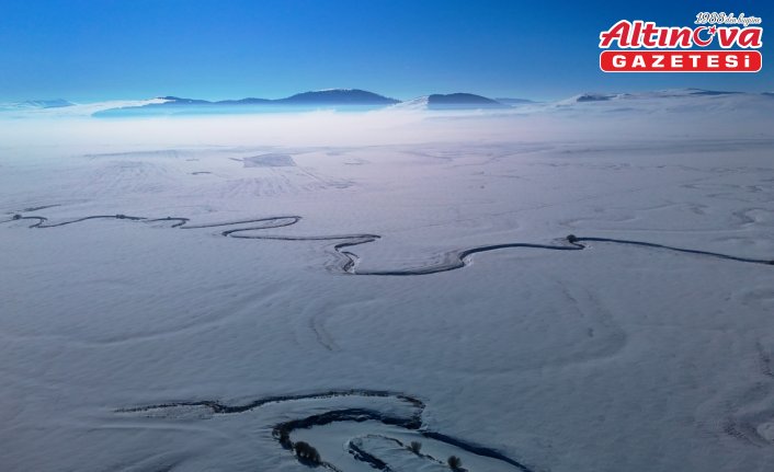 Göle ilçesinin Ova bölgesinde buzla kaplanan menderesler, dronla görüntülendi. ARDAHAN (AA)