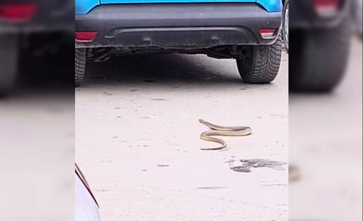 Cumhuriyet Meydanı'ndaki bir açık otoparkta bulunan vatandaşlar, sıcaktan etkilenen yılanın araçların altına girerek gölgelendiğini fark etti.