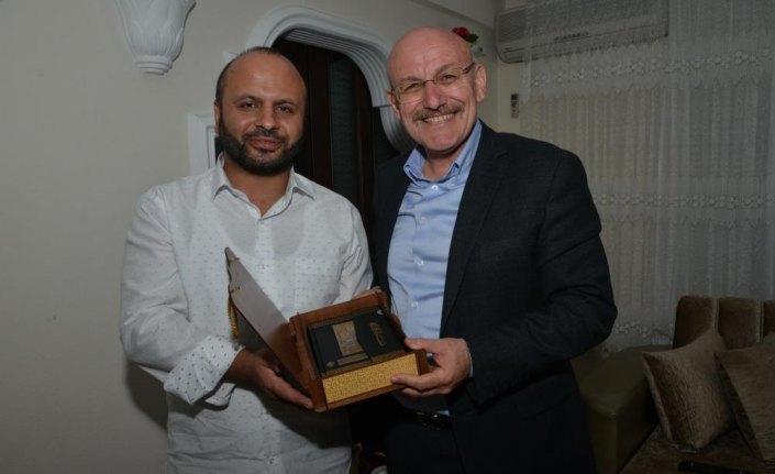 Başkan Kul, eşi Nuran Kul ile Terme'den hacca giden hemşehrilerini evlerinde ziyaret ederek Kur'an hediye ediyor.
