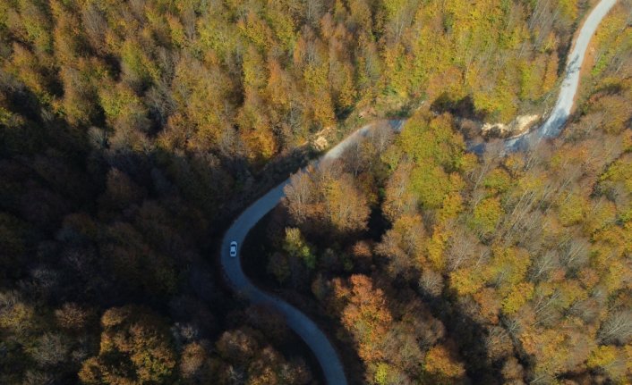 Güz renkleri arasında yolculuk yapma imkanı da sunan ormanlardaki sonbahar güzelliği, dronla da görüntülendi. DÜZCE (AA)