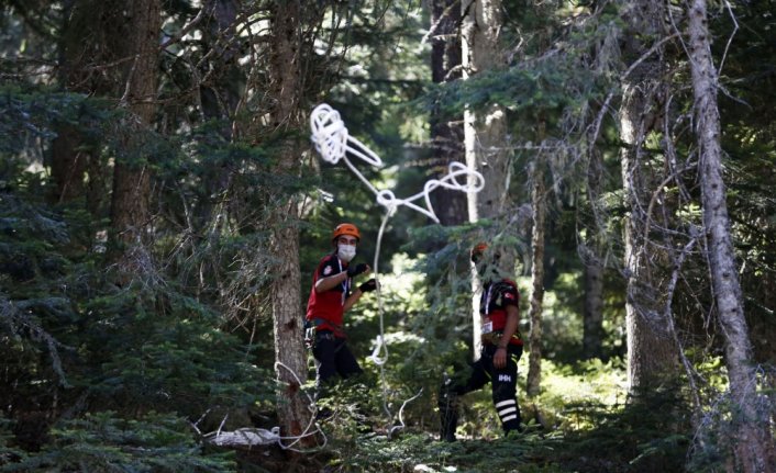 İple erişim, eğimli arazide kurtarma, havai hat kurtarma, pusula-GPS, arazi arama istasyonlarında çalışan ekipler, senaryo gereği kaybolan 20 kişiyi bulmak için çalışma yapıyor.