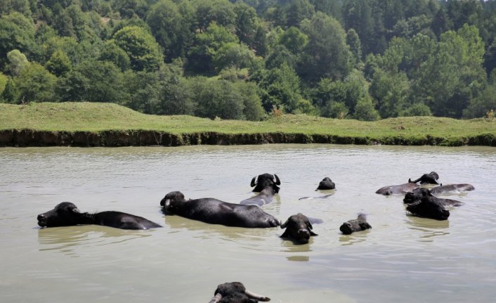 BOLU (AA) - Bolu'da besicilik yapan köylüler, mandalarını ağustos sıcağında Yeniköy Yaylası'ndaki gölette serinletiyor.