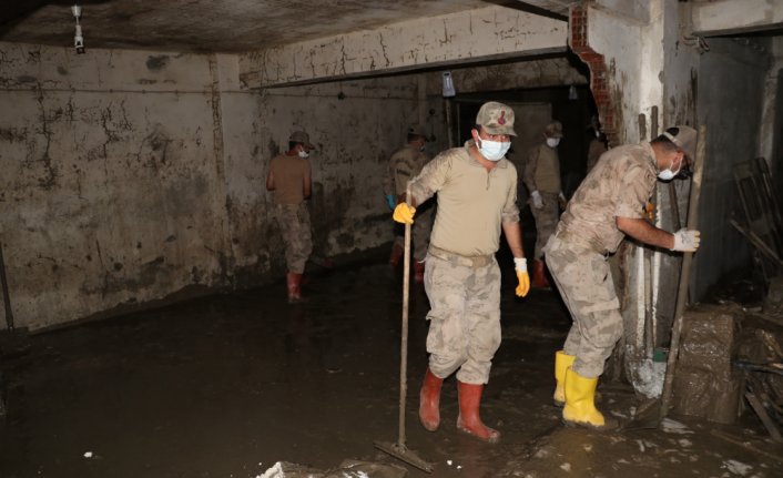 Kahraman'a ait iş yerindeki çamur, Safranbolu Jandarma Komando Eğitim Alayında görevli askerler tarafından temizleniyor.