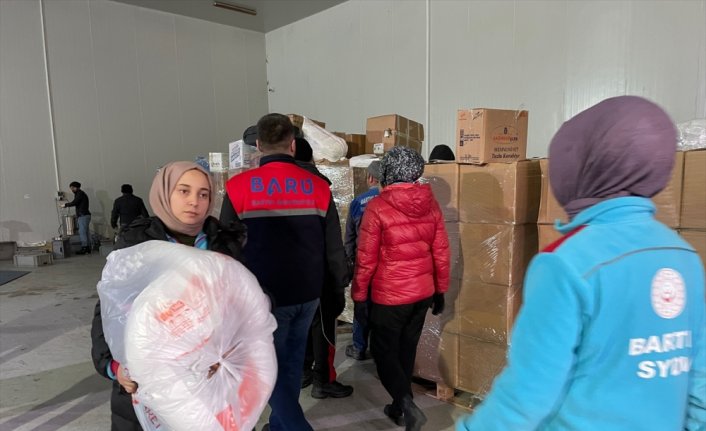 Bartın'da bağışlanan mont, bot, bere, eldiven gibi kışlık kıyafetlerin yanı sıra battaniye, çocuk bezi ve maması, hijyenik malzeme, gıda kolisi, tüplü katalitik sobalar tırlarla depremde etkilenen illere gönderiliyor.